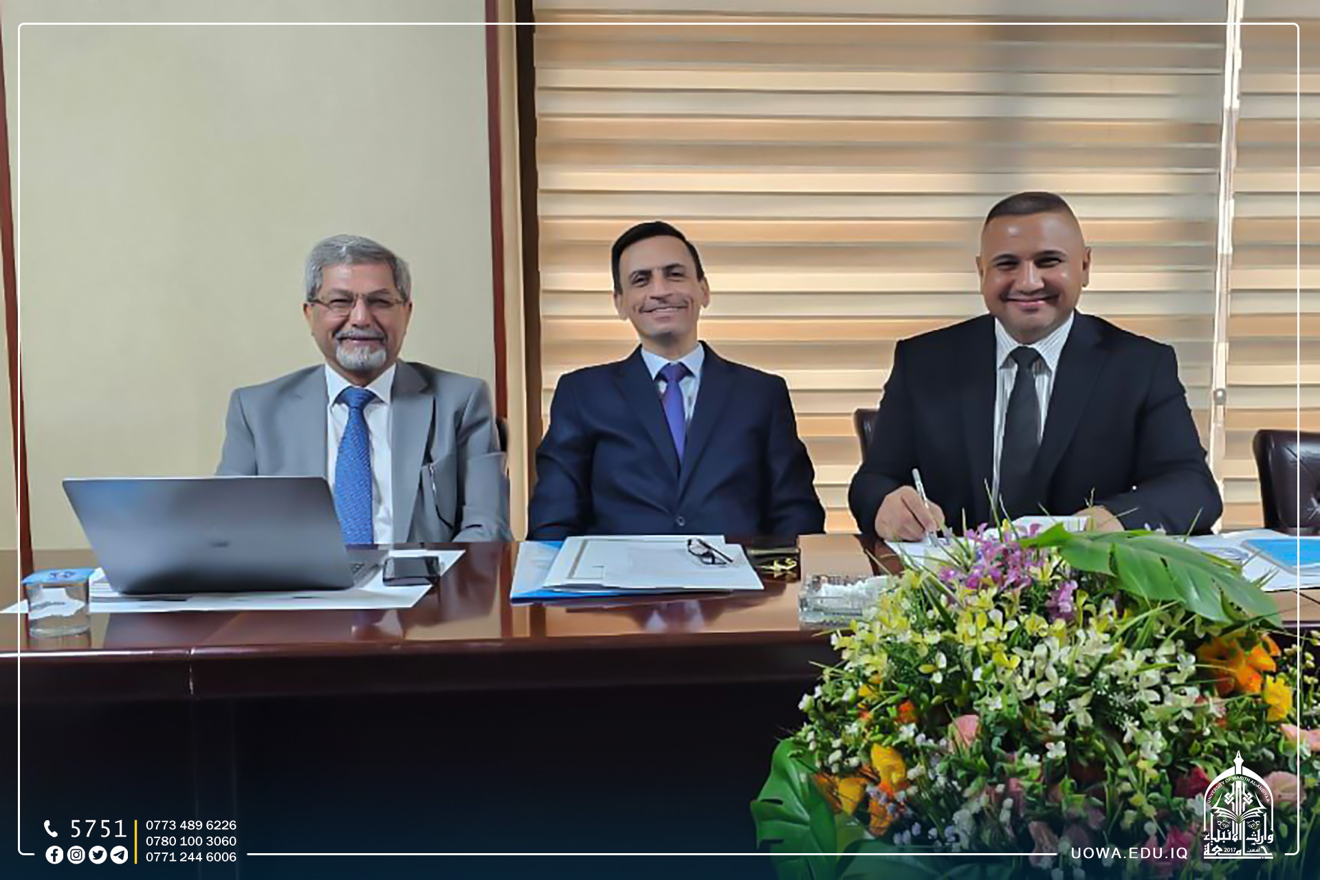 ضمن مساعي وزارة التعليم العالي والبحث العلمي لتطوير التعاون العلمي مع الجامعات الرصينة حول العالم، شارك وفد من جامعة وارث الانبياء(عليه السلام) برئاسة الاستاذ الدكتور ابراهيم الحياوي، بالإجتماع الذي عقد في جامعة بغداد بين جامعات (بغداد، النهرين، التكنولوجية وجامعة وارث الانبياء)، ووفد من جامعة دندي البريطانية بحضور مستشار رئيس الوزراء العراقي الاستاذ الدكتور حامد خلف احمد.