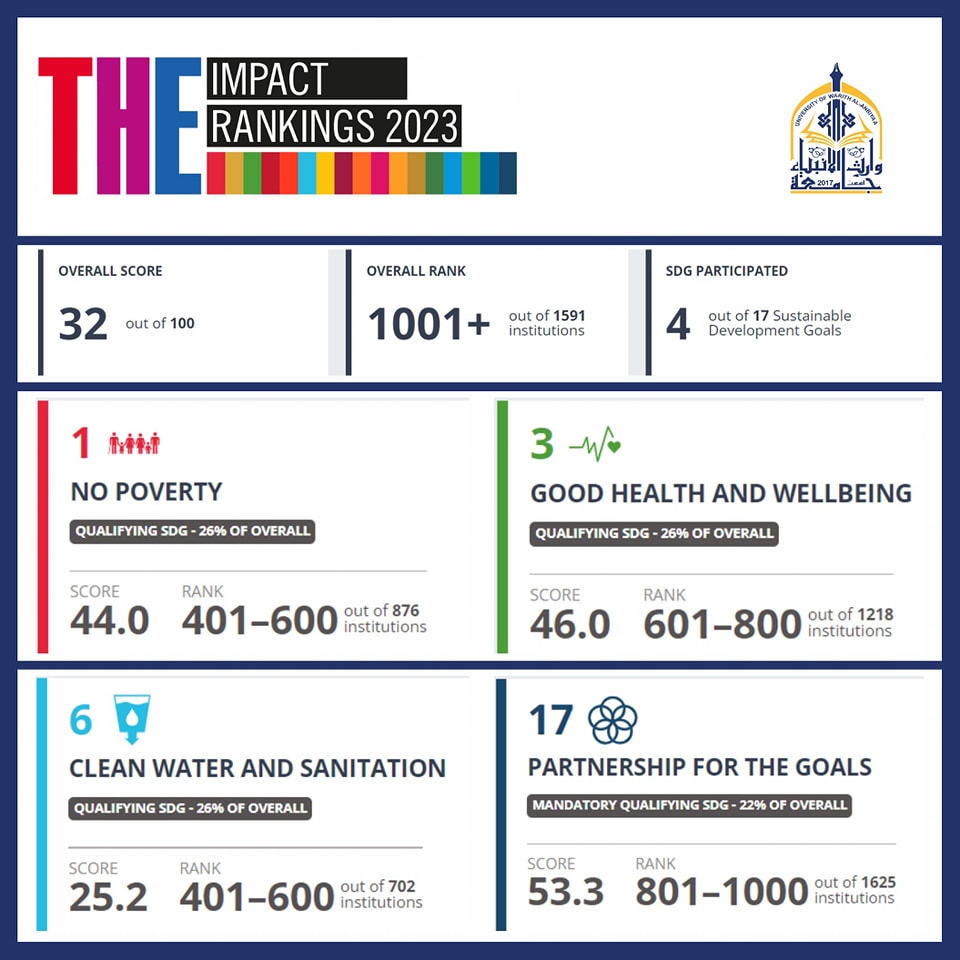 تستمر جامعة وارث الأنبياء في تعزيز تواجدها في ابرز التصنيفات العالمية، إذ تمكنت الجامعة من الظهور في تصنيف التايمز للاستدامة Times Impact Ranking للعام الثاني على التوالي، تأتي هذه النتائج بعد الجهود المتميزة التي تبذلها الجامعة في تعزيز مسؤوليتها الاجتماعية من خلال تضمين متطلبات الاستدامة في عملياتها التعليمية والادارية، وأظهرت النتائج التفصيلية حصول الجامعة على مراكز جيده في الاستدامه