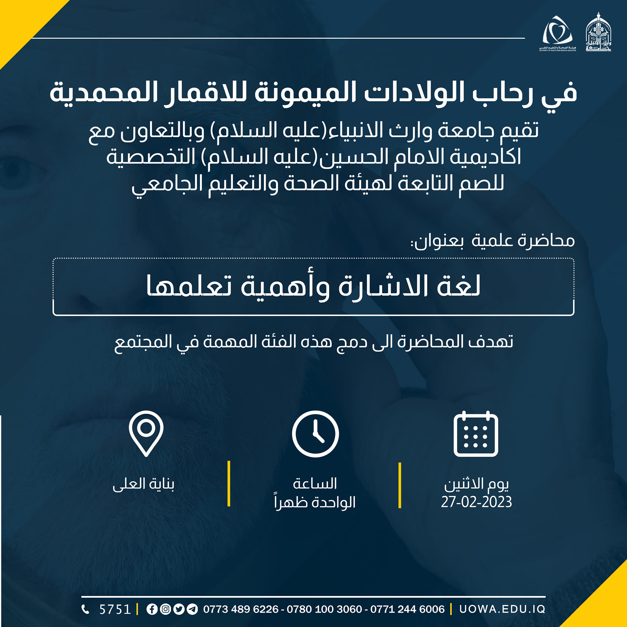 ضمن مبادرة "بركات الانوار المحمدية" التي اطلقتها هيئة الصحة والتعليم الجامعي، نظمت كلية العلوم الاسلامية في جامعة وارث الانبياء (عليه السلام) زيارة علمية لطلبة الكلية برفقة عمادة الكلية، للإطلاع على الفعاليات العلمية "لمهرجان ربيع الشهادة"، إذ اطلع الطلبة على (معرض الكتاب) والجلسات البحثية المقامة داخل الصحن الحسيني المطهر.