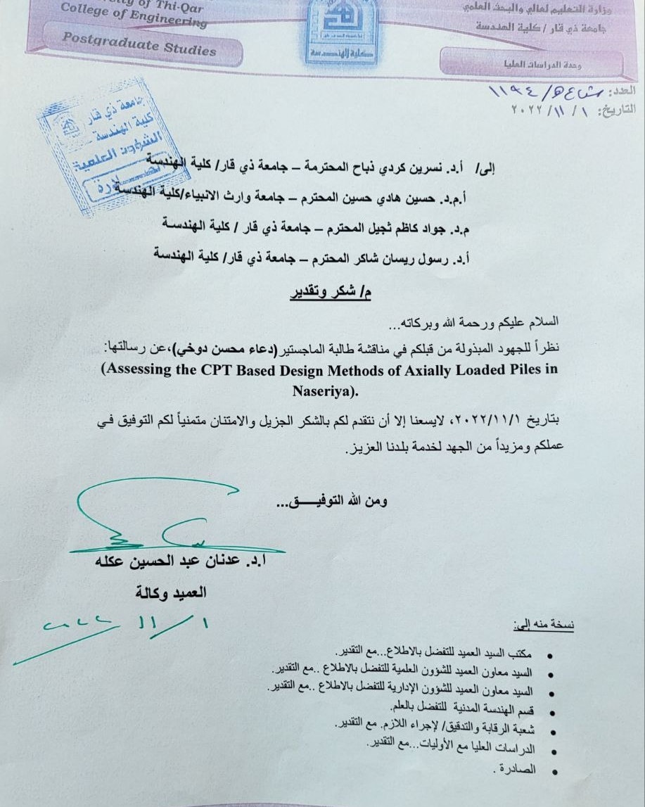 نظراً لما تمتلكه جامعة وارث الانبياء(عليه السلام) من طاقات أكاديمية متميزة، اختير عميد كلية الهندسة الأستاذ المساعد الدكتور حسين هادي عضواً لمناقشة رسالة ماجستير لاحد طلبة الدراسات العليا في جامعة ذي قار/ كلية الهندسة