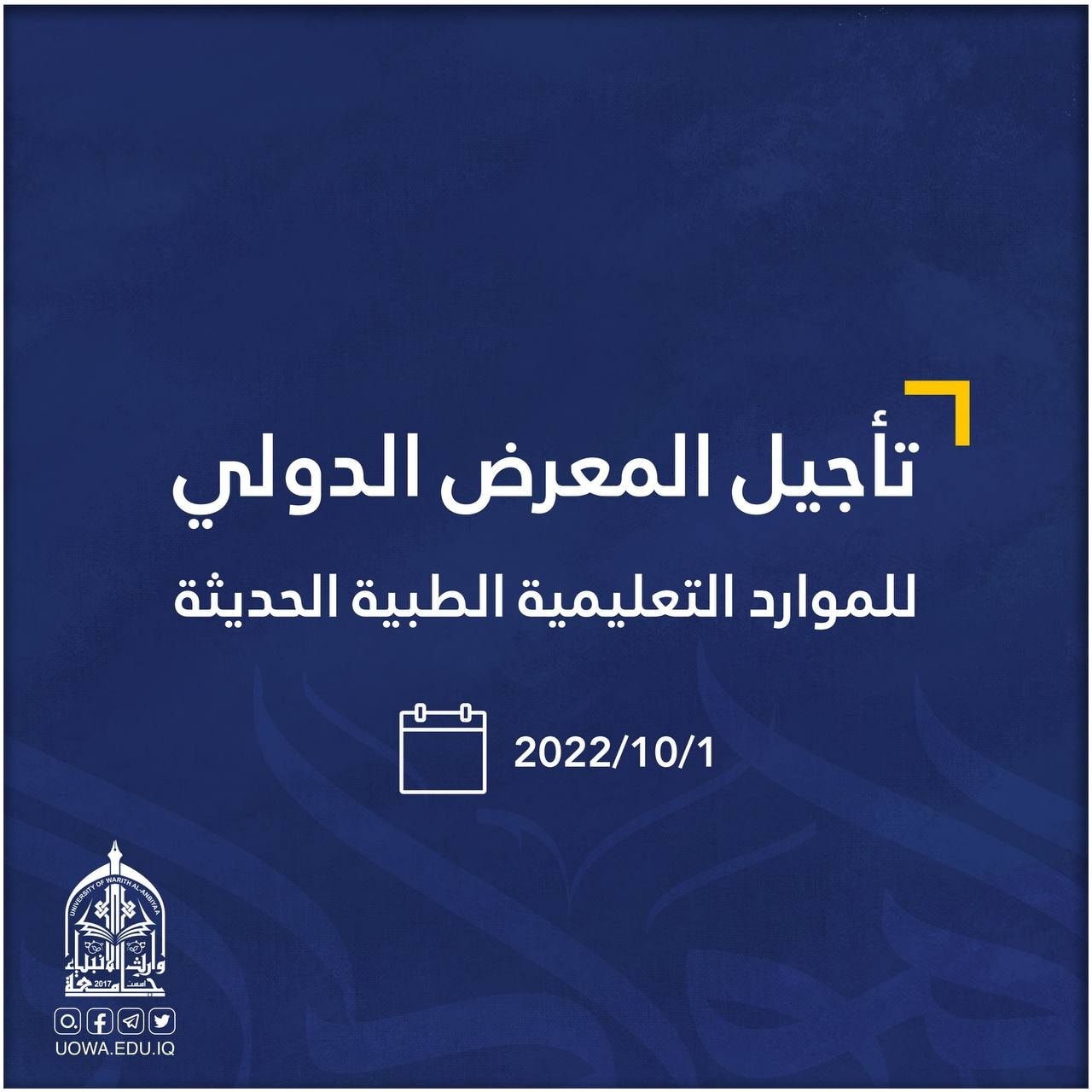 استجابة لطلبات المشاركين في فعاليات (المعرض الدولي للموارد التعليمية الحديثة)، والذي تقيمه الامانة العامة للعتبة الحسينية المقدسة/ هيأة التعليم الجامعي، برعاية وزارة التعليم العالي والبحث العلمي وبالتعاون مع جامعتي وارث الانبياء والزهراء للبنات (عليهم السلام).قررت اللجنة التحضيرية العليا تأجيل انطلاق فعاليات المعرض الى تاريخ 1/ 10/ 2022، من أجل اتاحة الفرصة أمام الشركات ودور النشر العالمية المشاركة لشحن منتجاتها الى مدينة كربلاء المقدسة ومكان انعقاد المعرض في جامعة الزهراء (عليه السلام) للبنات.علماً أن باب المشاركة ما يزال مفتوح للشركات المحلية والعالمية والجامعات كافة ودور النشر الراغبة بالمشاركة في هذا الحدث الدولي المهم
