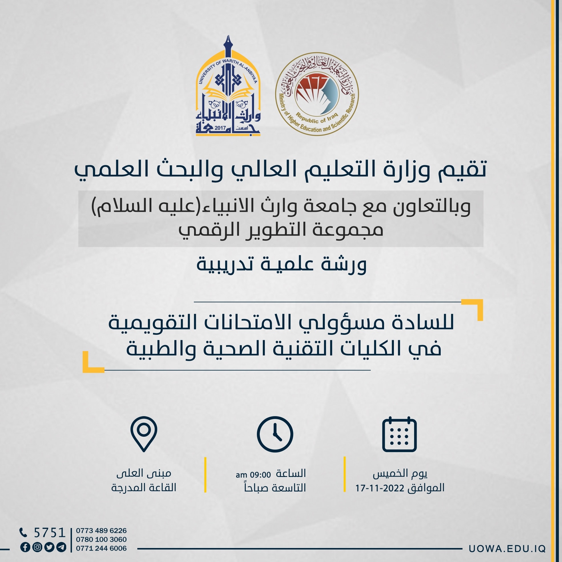تقيم وزارة التعليم العالي والبحث العلمي وبالتعاون مع جامعة وارث الانبياء (عليه السلام) مجموعة التطوير الرقمي ورشة علمية تدريبية للسادة مسؤولي الامتحانات التقويمية في الكليات التقنية الصحية والطبية