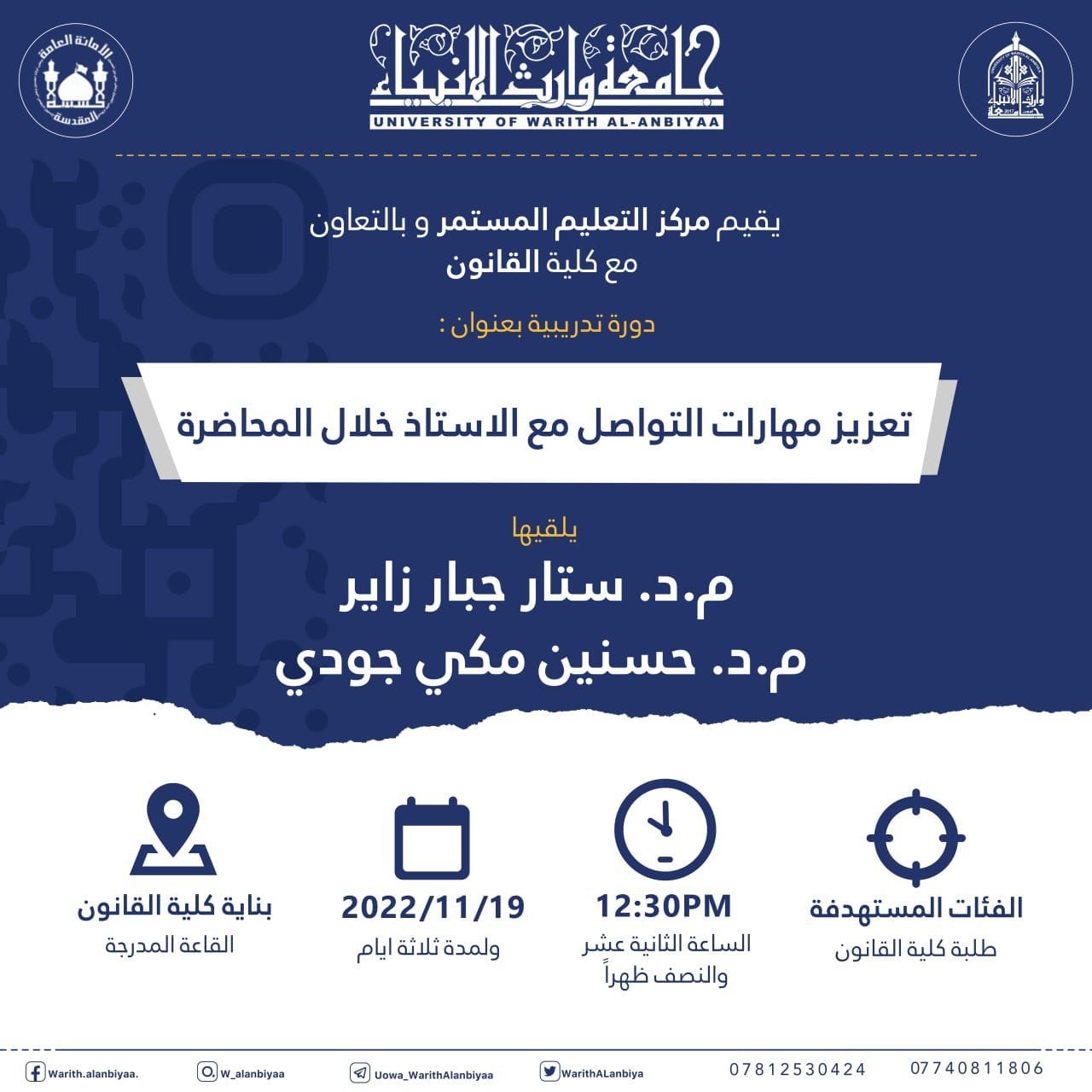 تقيم كلية الإدارة والاقتصاد في جامعة وارث الأنبياء (عليه السلام) حلقة نقاشية تحت عنوان "ورشة التطوير المهني"، يقدمها أ. م.د ضياء فالح بناي، اليوم السبت الموافق 3/12/2022 في تمام الــــــ ( 12 ) ظهراً.