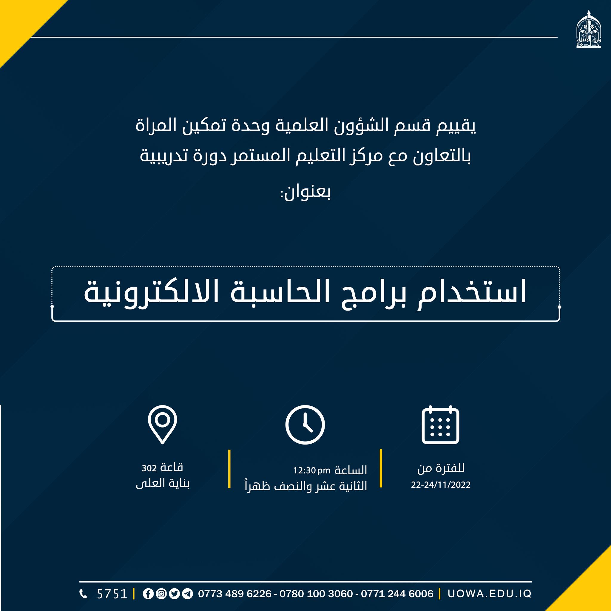 يقيم قسم الشؤون العلمية- وحدة تمكين المرأة في جامعة وارث الأنبياء (عليه السلام) ضمن حملة (16) يوم للقضاء على العنف ضد المرأة ندوة علمية بعنوان (التمكين الرقمي للمرأة ودوره في الحد من التمييز على أساس الجنس)، وذلك يوم السبت الموافق 3/12/ 2022 في تمام الساعة الثانية عشرة (12) ظهراً على القاعة المدرجة بكلية التمريض