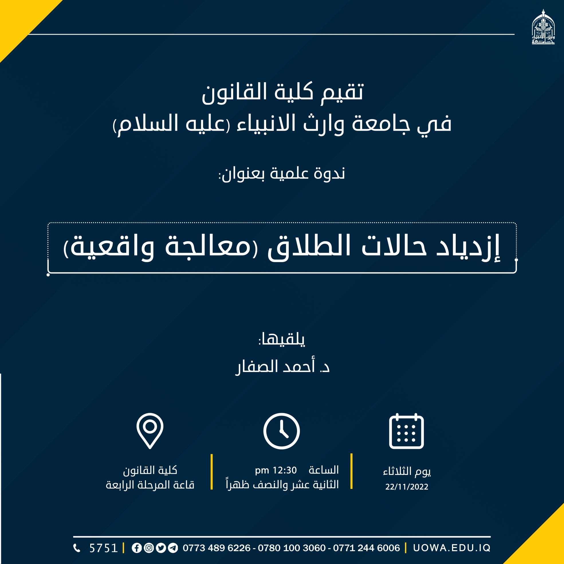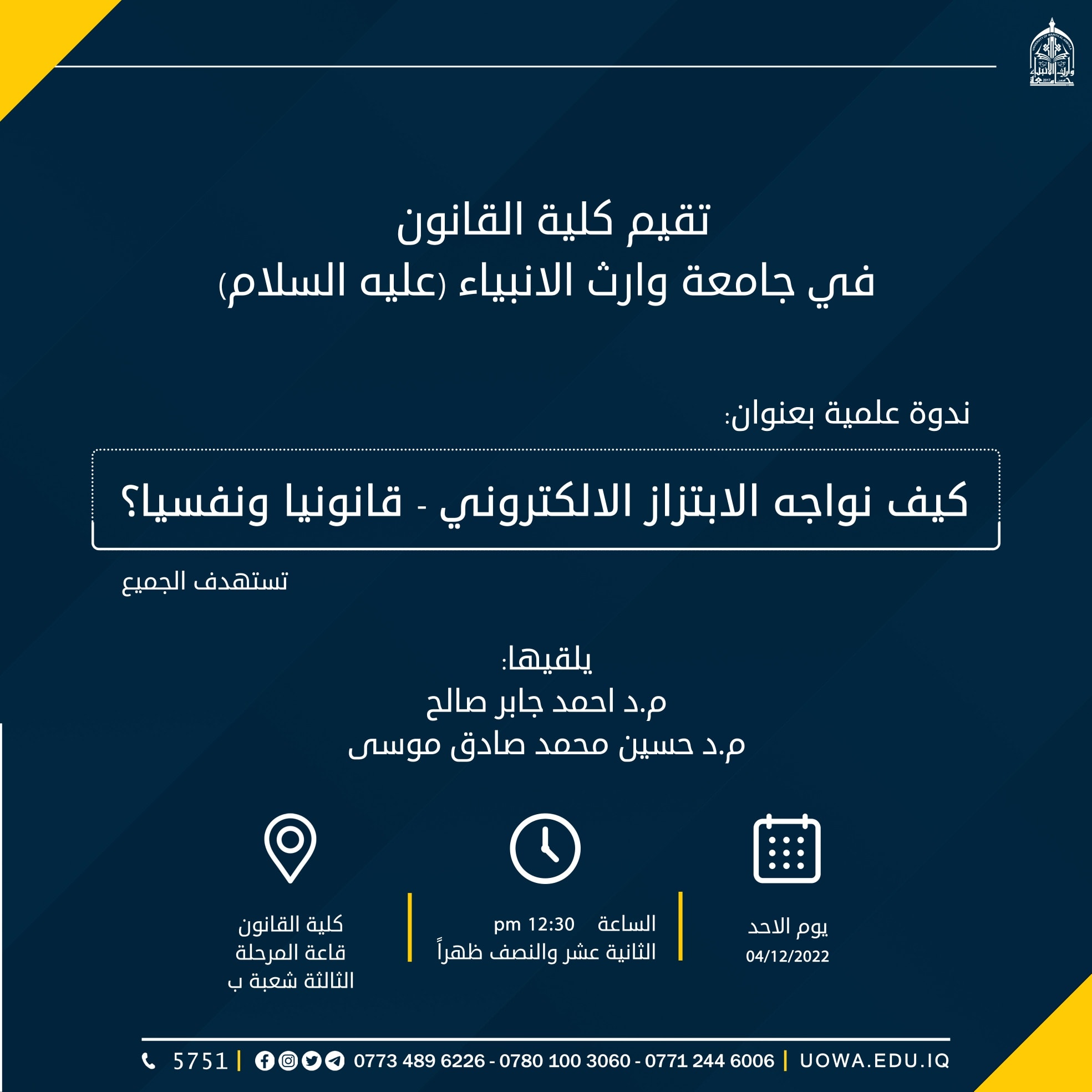 تقيم كلية القانون في جامعة وارث الأنبياء (عليه السلام) ندوة علمية بعنوان: