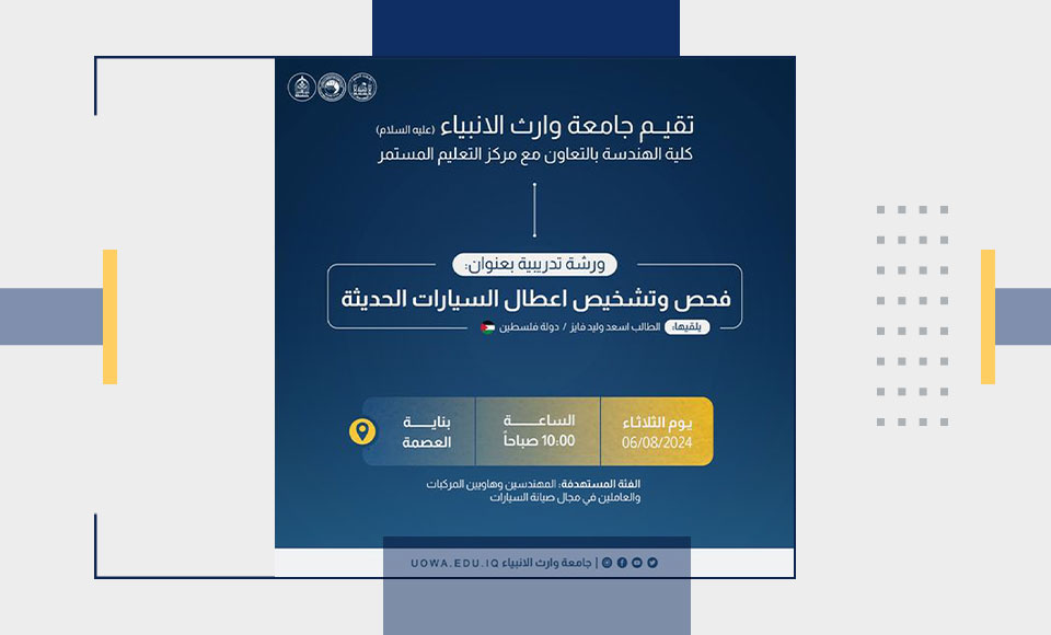 أقامت كلية الهندسة بالتعاون مع قسم التعليم المستمر في جامعة وارث الأنبياء (عليه السلام)، اليوم الثلاثاء، ورشة تدريبية تحت عنوان (فحص وتشخيص أعطال السيارات الحديثة)،في بناية العصمة.