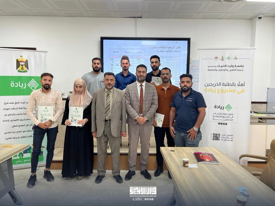 استئناف الدورات التدريبية ضمن مبادرة"ريادة" الحكومية التي تقيمها جامعة وارث الانبياء(عليه السلام)/ شعبة التأهيل والتوظيف، والتي تهدف إلى دعم مشاريع الطلاب والخريجين ،بمشاركة المدربين صفاء السيلاوي وفاطمة الكاصد، و تنظيم هذه الدورة بشكل دائم على مدار أسبوعين في الشهر.