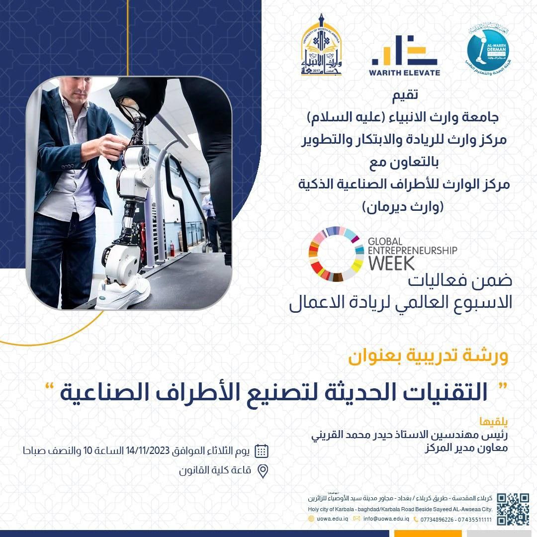 يقيم مركز وارث للريادة والابتكار والتطوير في جامعة وارث الأنبياء )عليه السلام( بالتعاون مع مركز الوارث للأطراف الصناعية الذكية (وارث ديرمان)، ضمن فعاليات اسبوع ريادة الاعمال العالمية ورشة تدريبية بعنوان " التقنيات الحديثة لتصنيع الأطراف الصناعية ".