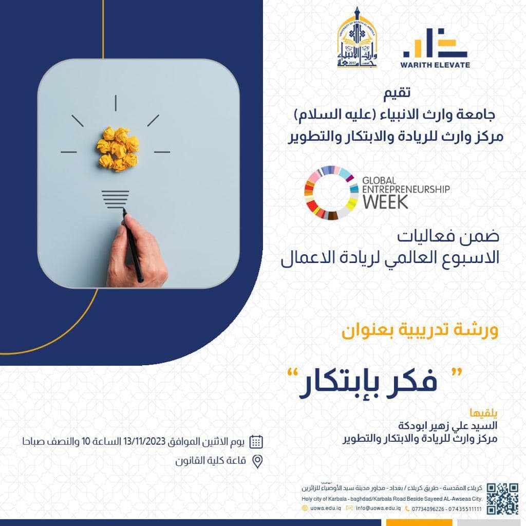 استعد لتجاوز المألوف وإشعال ما هو استثنائي بداخلك! يقيم مركز وارث للريادة والابتكار والتطوير في جامعة وارث الأنبياء عليه السلام ضمن فعاليات اسبوع ريادة الاعمال العالمية ورشة تدريبية بعنوان "فكر بابتكار: تنمية مهارات ريادة الأعمال" التي يلقيها السيد علي زهير ابودكه انضم إلينا لتجربة غامرة حيث تلتقي روح الابتكار مع جوهر ريادة الأعمال.