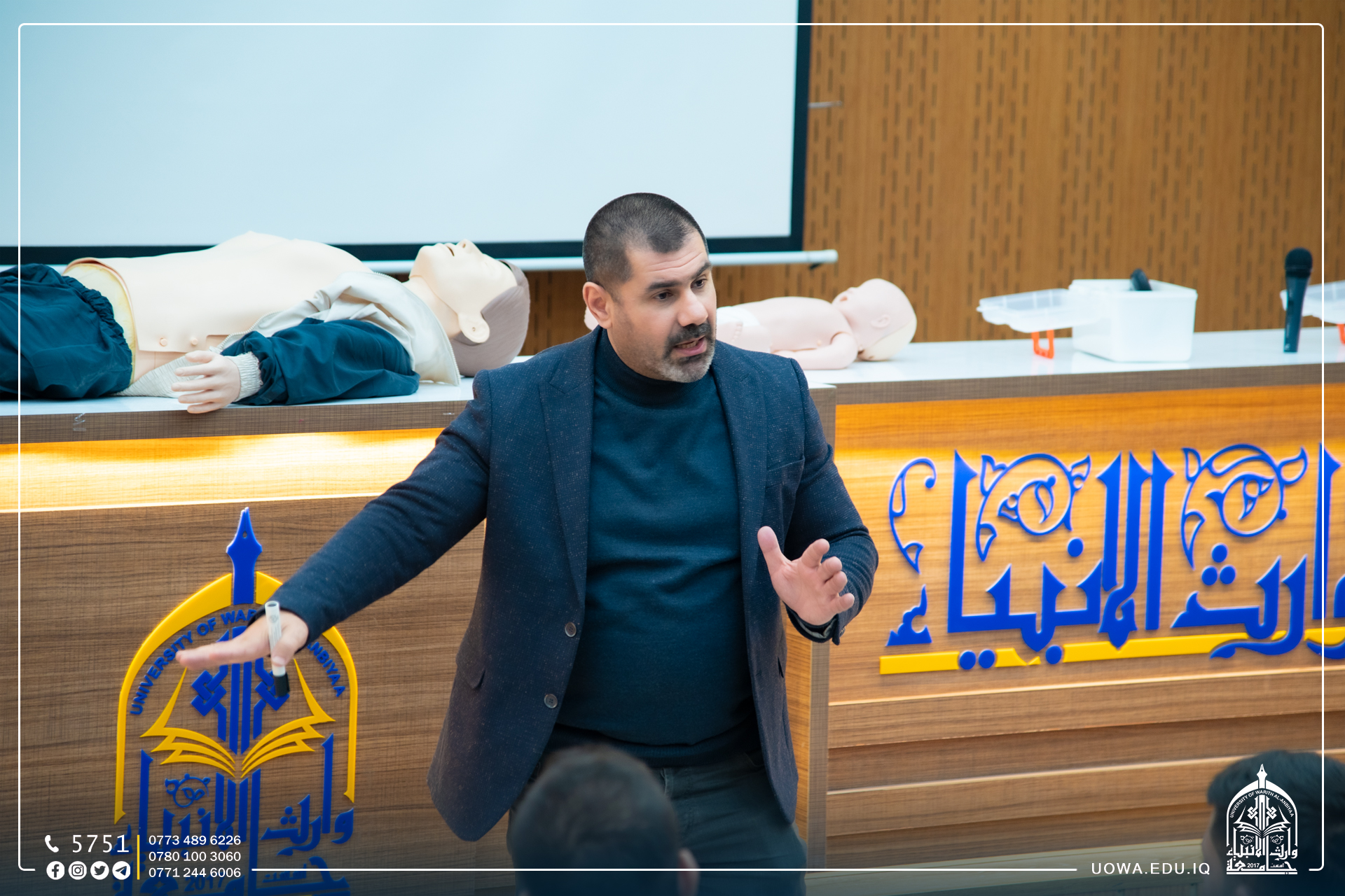 أقامت كلية الطب في جامعة وارث الأنبياء(عليه السلام) وبالتنسيق مع جمعية الهلال الأحمر العراقي فرع كربلاء المقدسة، ورشة عمل تدريبية لطلبة الكلية في" الأسعافات الأولية" ، وتضمنت الورشة تدريب المشاركين على كيفية إسعاف المرضى والجرحى في الحالات الطارئة والحوادث و كافة الخطوات الواجب القيام بها للتعامل مع هذه الحالات بالشكل المبسط وبتطبيق عملي لتسهيل التعلم والتصرف بحكمة لتفادي هذه المشاكل.