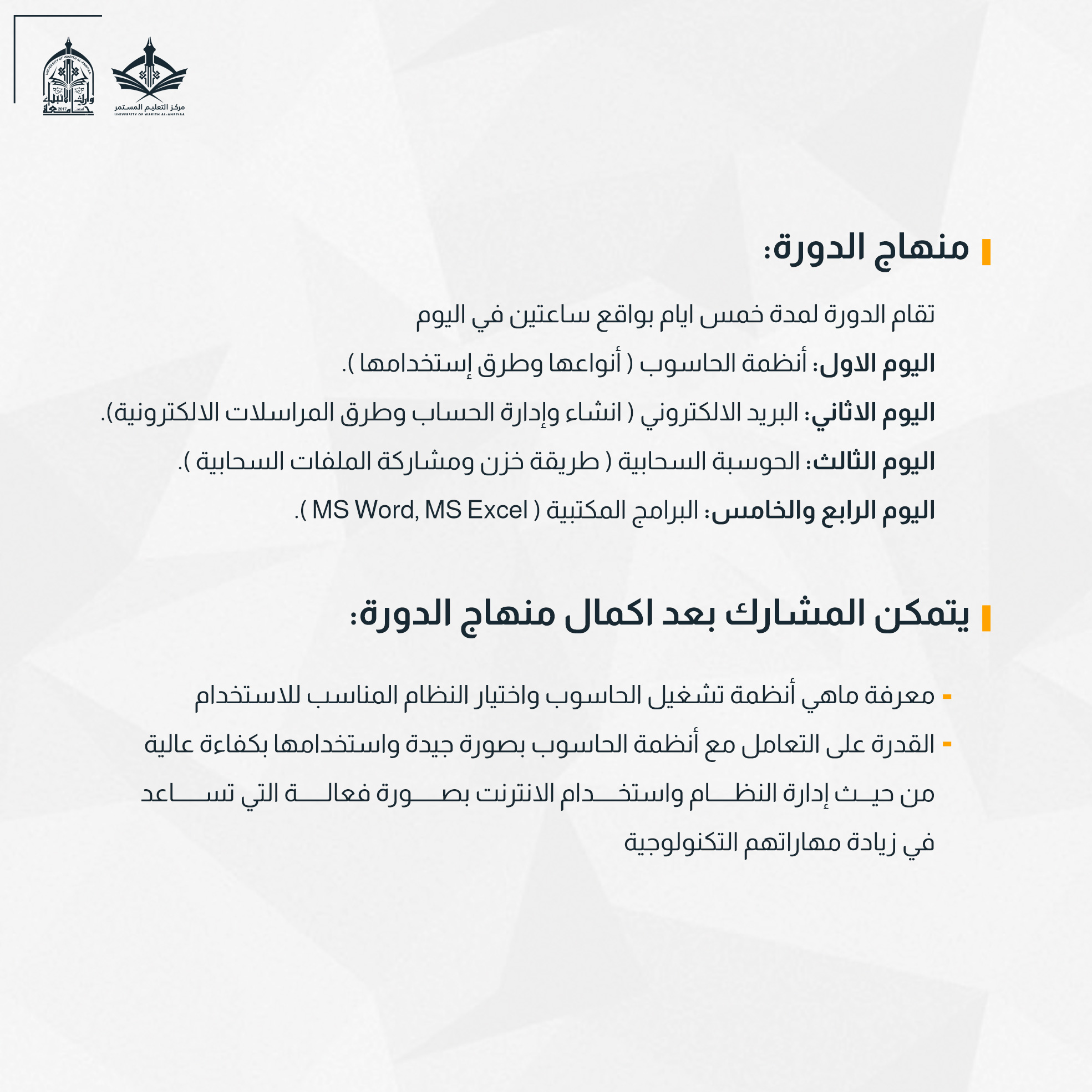 يذكر أن مركز التعليم المستمر قد اعد برنامج مكثف لتزويد طلبة الجامعة وبالاخص طلبة المرحلة الرابعة المقبلين على التخرج بالمهارات اللازمة لزجهم في سوق العمل.