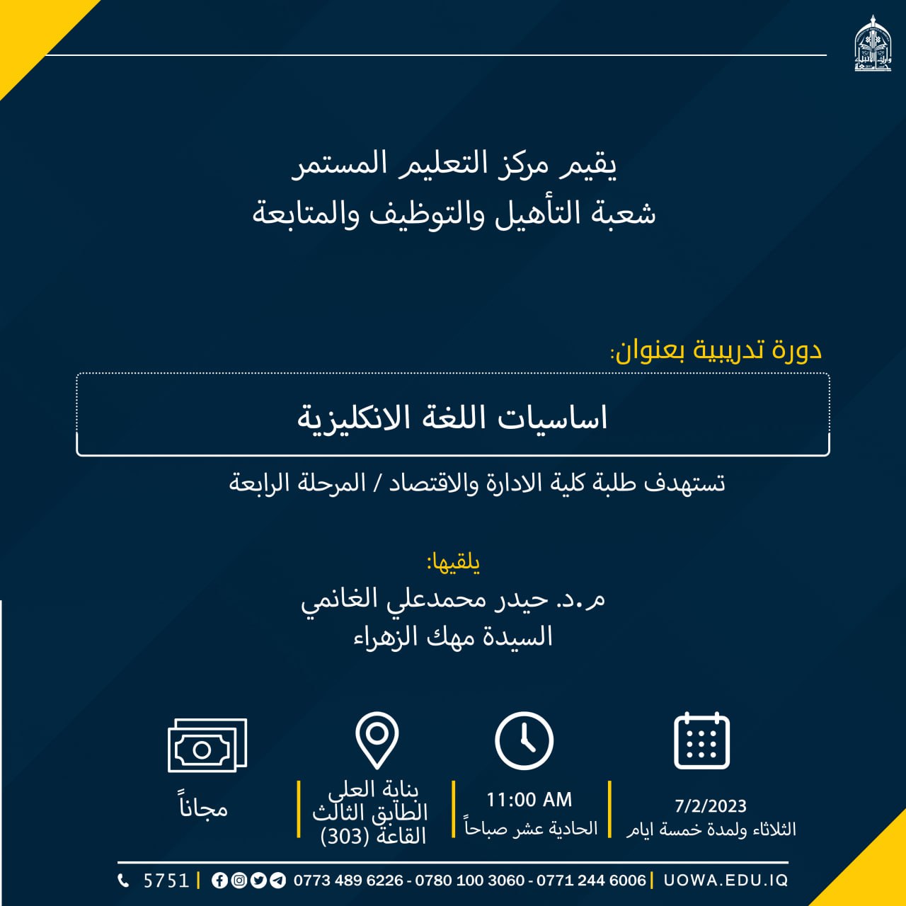 سعياً للإستفادة من العطلة الربيعية وتزويد الطلبة المقبلين على التخرج بالمهارات التي تمكنهم من الانخراط في سوق العمل، أقام مركز التعليم المستمر/ شعبة التأهيل والتوظيف والمتابعة دورة تدريبية لطلبة المرحلة الرابعة في كلية الادارة والاقتصاد بعنوان "اساسيات نظام المحاسبة الموحد " استمرت لمدة خمسة ايام، قدمها كل من م.م عبدالله سلام العادلي وم.م حيدر صالح عبد الهادي.