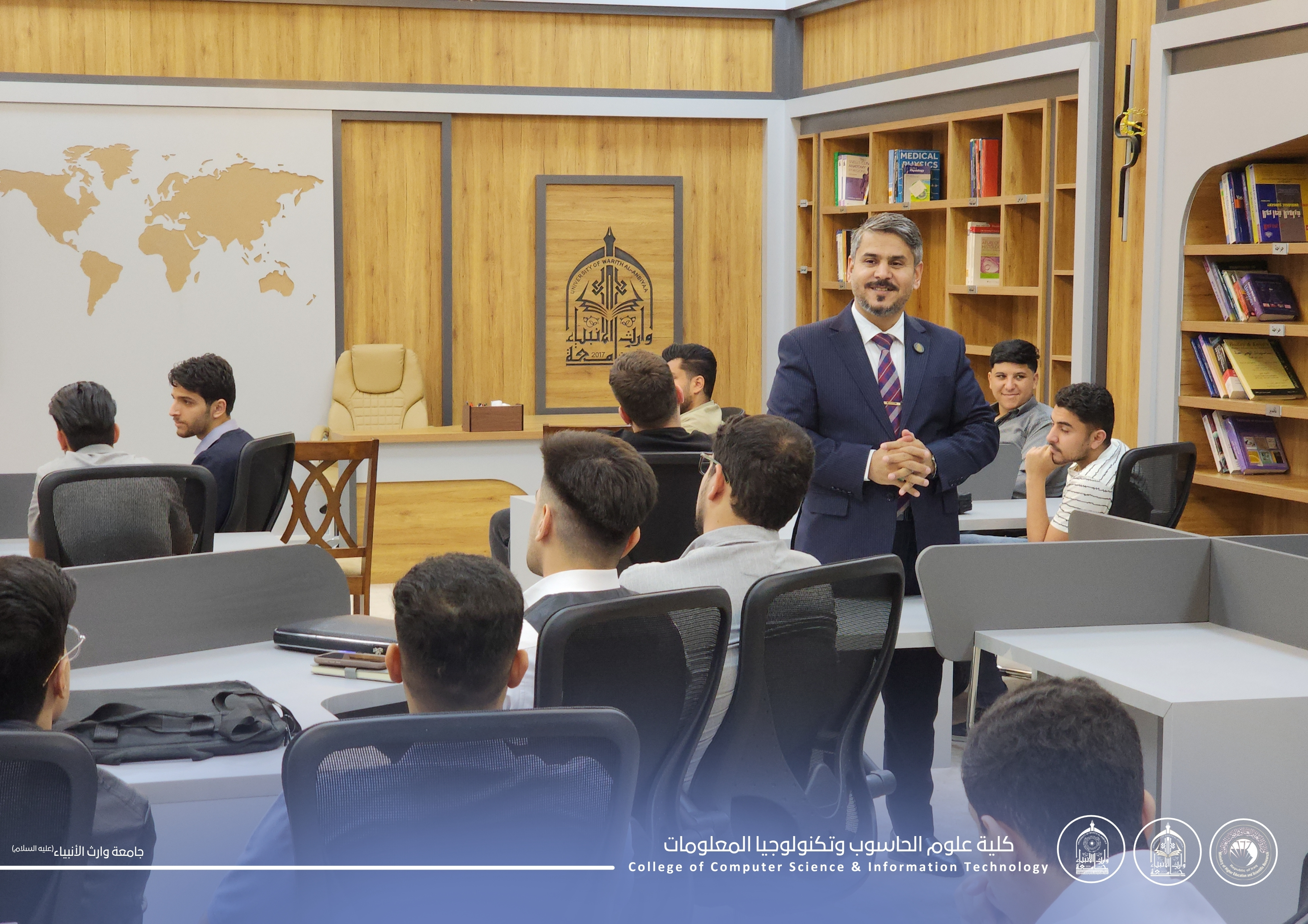 A delegation from the Faculty of Media at Al-Waritheen University, affiliated with the Holy Hussein Shrine, discussed with the deanship of the Faculty of Media at Thi Qar University the latest developments in the field of media, artificial intelligence, and joint evaluation exams