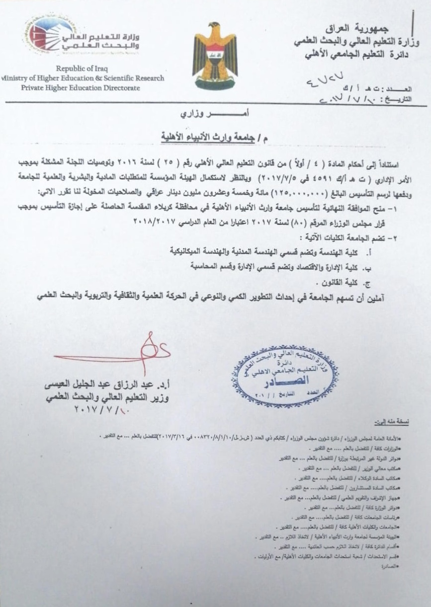 The Ministry of Higher Education and Scientific Research has granted the final approval for the establishment of Warith Al-Anbiyaa University (peace be upon him) under the decision of the Council of Ministers, numbered (80) for the year 2017, starting from the academic year (2017-2018).