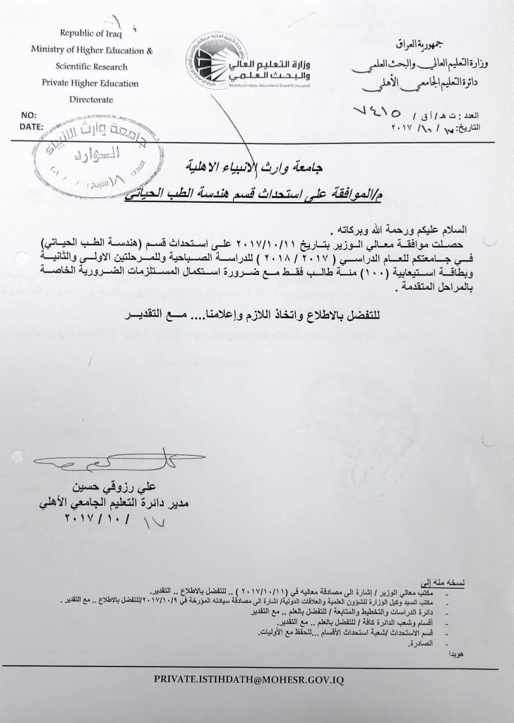 Approval was granted by His Excellency the Minister on (11-10-2017) to establish the Biomedical Engineering Department at Warith Al-Anbiyaa University (peace be upon him) for the academic year (2017-2018) for the morning study program.