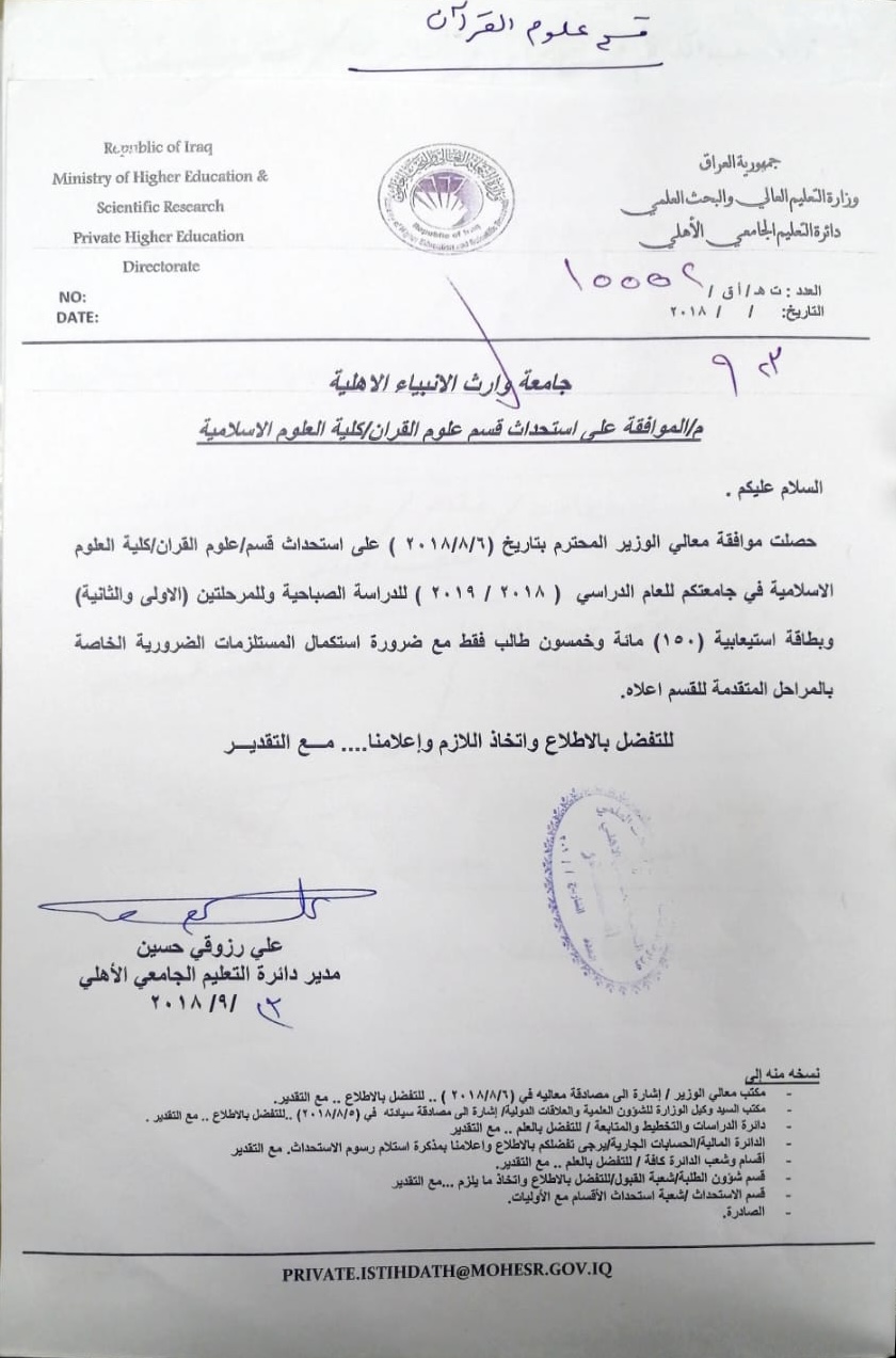 Approval was granted by His Excellency the Minister on (6-8-2018) to establish the Quranic Sciences Department at the College of Islamic Sciences, Warith Al-Anbiyaa University (peace be upon him), for the academic year 2018-2019 for the morning study program