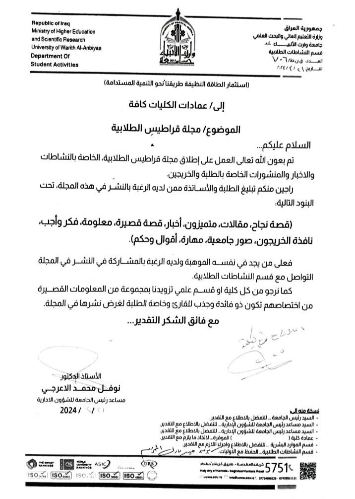 The University Presidency stated that this step comes in implementation of the directives of the Representative of the Supreme Religious Authority, Sheikh Abdul Mahdi Al-Karbalai, emphasizing the importance of keeping pace with scientific progress and enhancing the academic reality to meet the needs of the labor market.
