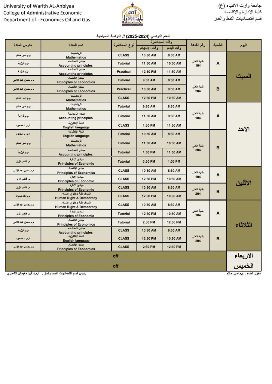 The University of Warith Al-Anbiyaa  is pleased to announce the establishment of the Evening Studies Program for the Department of Oil and Gas Economics at the College of Administration and Economics.