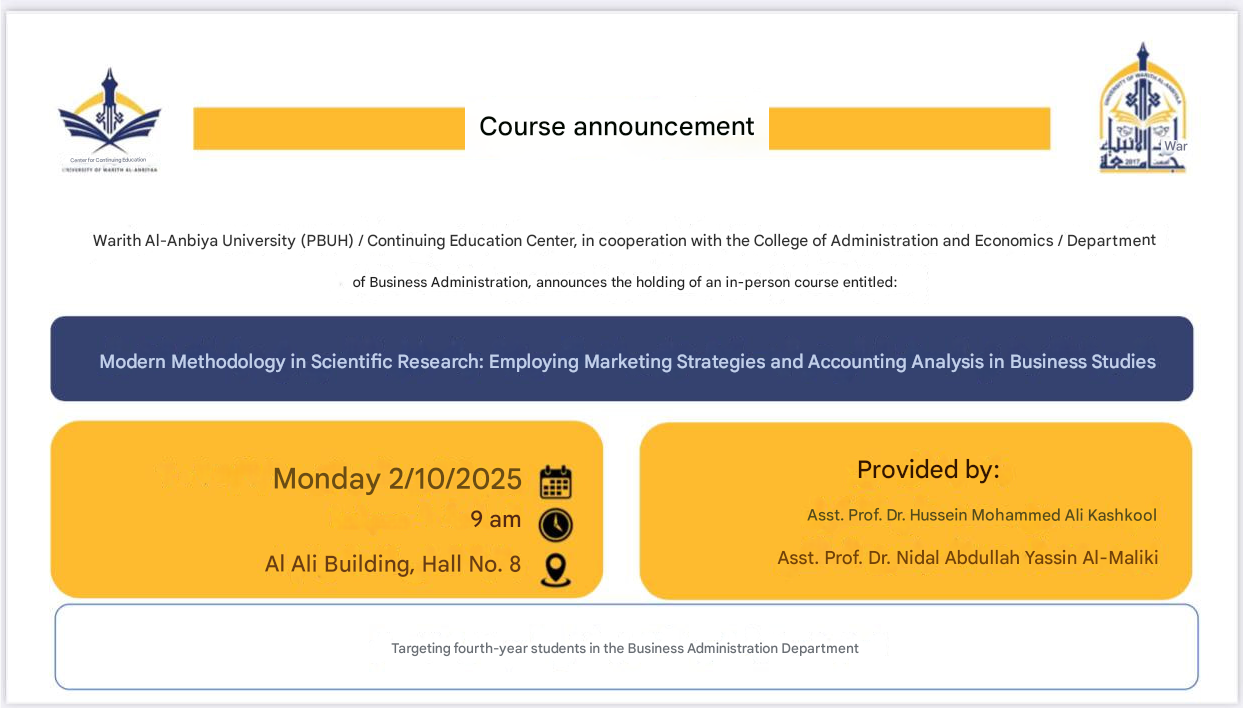 The College of Administration and Economics at Al-Warith University is holding a course titled