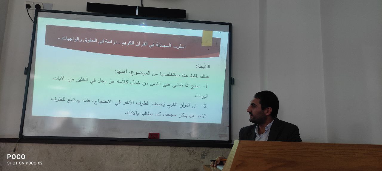 The seminar was presented by Assistant Lecturer Haider Nasser, a faculty member at the College of Administration and Economics, and Mr. Muhannad Rashid Al-Majdi, a graduate student at the University of Karbala.