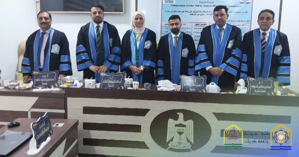 Assistant Professor Dr. Hassan Taleb Hashem participated in the discussion of a master's thesis for a researcher from the University of Karbala tagged: (Improving solar distillation by analyzing heat transfer and using a Fresnel lens) by researcher Amir Abdul Salam Abd Aoun Hayy The thesis dealt with a technology used to desalinate water and obtain distilled water from salt water using a Fresnel lens to focus rays and phase change materials to store the rays during the day and then return them to the device when there is no solar rays, This method can use heat and how to benefit from it in this process and reduce the overall cost and improve performance.