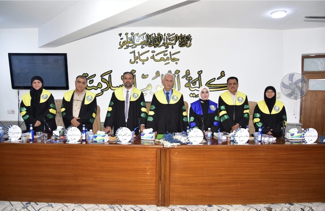 The discussion committee consisted of a group of specialized professors, namely:1. Prof. Dr. Muhammad Talib Al-Hussaini - Chairman2. Prof. Dr. Yaqzan Sami Muhammad - Member3. Prof. Dr. Furat Abdul Karim Zaghir - Member4. Prof. Dr. Qaisar Kazim Ajil - Member5. Prof. Dr. Fardous Hashim Ahmed - Member6. Prof. Dr. Sakina Aziz Al-Fatli - Member and Supervisor