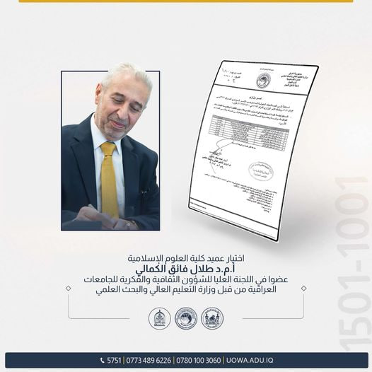 Assistant Prof. Dr. Talal Faiq Al-Kamali, Dean of the College of Islamic Sciences at Al-Warith University, was selected as a member of the Higher Ministerial Committee for "Cultural and Intellectual Affairs of Universities." This appointment was made in recognition of his academic and scientific qualifications, as well as his significant cultural and intellectual contributions.