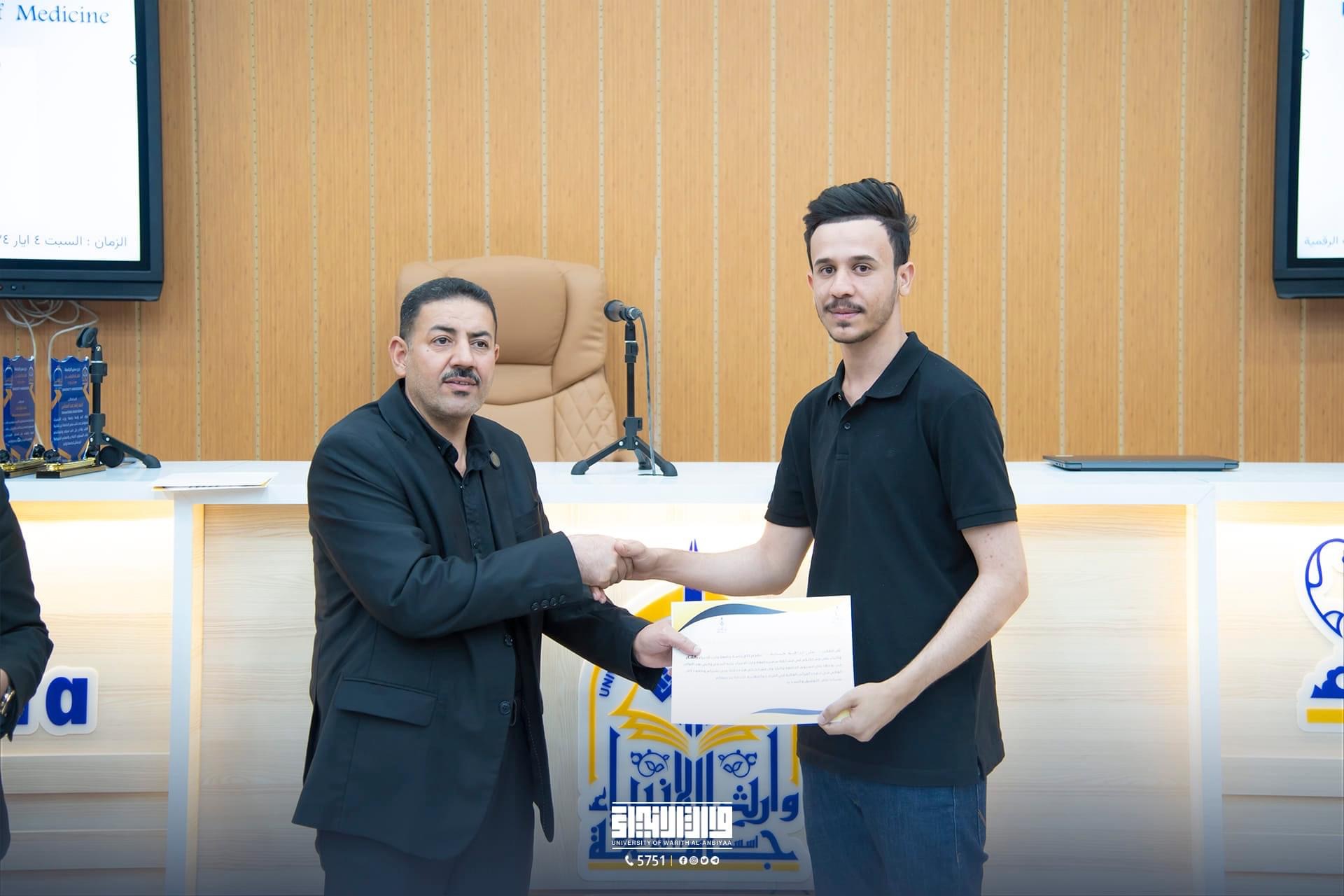 Under the patronage of the President of the University, Professor Dr. Ibrahim Saeed Al-Hayawi, and in the presence of the Dean of the Faculty of Medicine, Professor Dr. Ali Abd Saadoun Al-Ghazi, the Deanship of the Faculty of Medicine, in cooperation with the “Warith Elevate” team and the Department of Quality Assurance and University Performance, launched the project (Preparation and Selection of University Medical Ambassadors), which aims to represent the university and the country, whether locally or internationally.