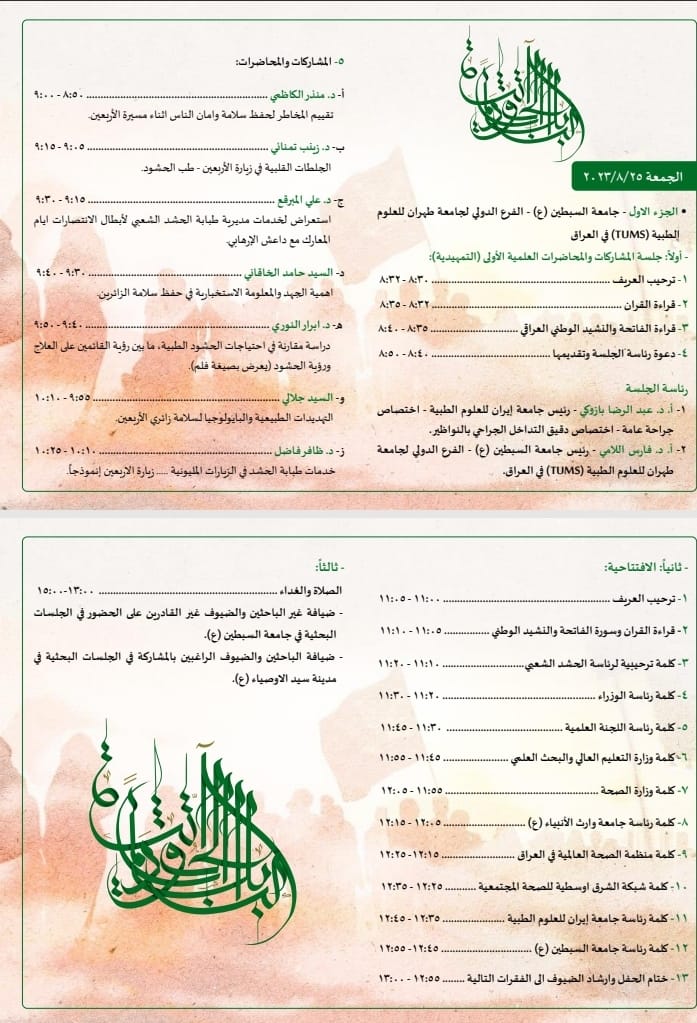 The Popular Mobilization Authority, in collaboration with the University of Warith Al-Anbiyaa (Peace Be Upon Him), is organizing the "First International Medical Mobilization Conference" in cooperation with the Ministry of Higher Education and the Ministry of Health. The conference is held under the theme "Medical Mobilization... The Arbaeen Pilgrimage as a Model" and is scheduled for tomorrow, Friday, August 25, 2023, within the premises of both the University of Warith Al-Anbiyaa (Peace Be Upon Him) and Al-Sibtayn University (Peace Be Upon Them).