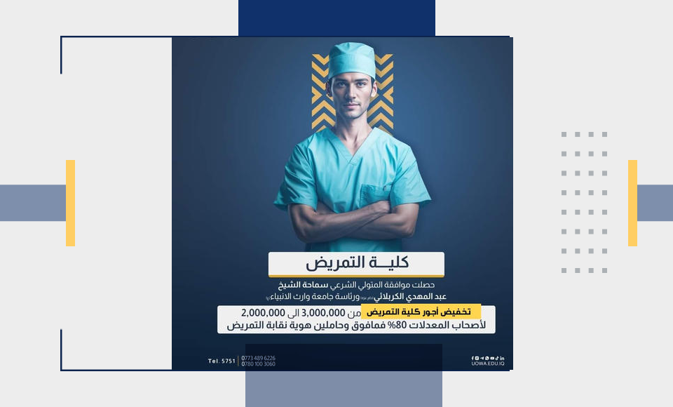 The College of Nursing at the University of Warith Al-Anbiyaa has signed a new scientific cooperation agreement with the provincial Nursing Syndicate, marking a pioneering step aimed at empowering nursing professionals and opening broad academic pathways for them to obtain advanced university qualifications that contribute to the development of their professional performance.
