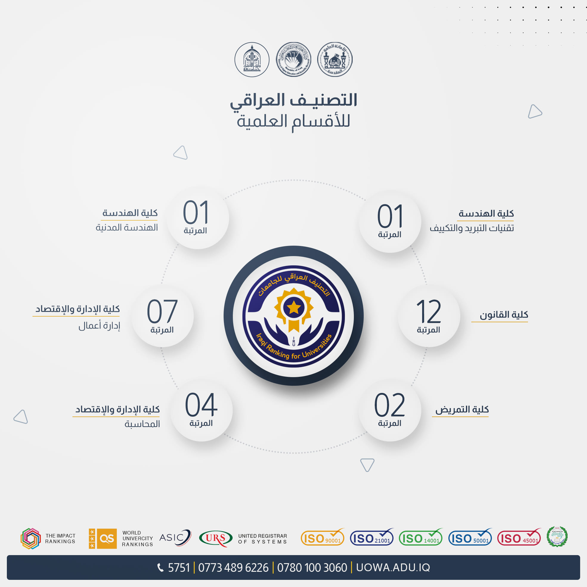 In the field of engineering, the Department of Refrigeration and Air Conditioning Technologies in the College of Engineering secured the first position nationwide in the Iraqi ranking, while the Department of Civil Engineering ranked first among private universities and tenth among government universities. Additionally, the Nursing Department achieved the second position among private universities and the fifth position among government universities. The Accounting Department in the College of Administration and Economics secured the fourth position among private universities and the tenth position among government universities.