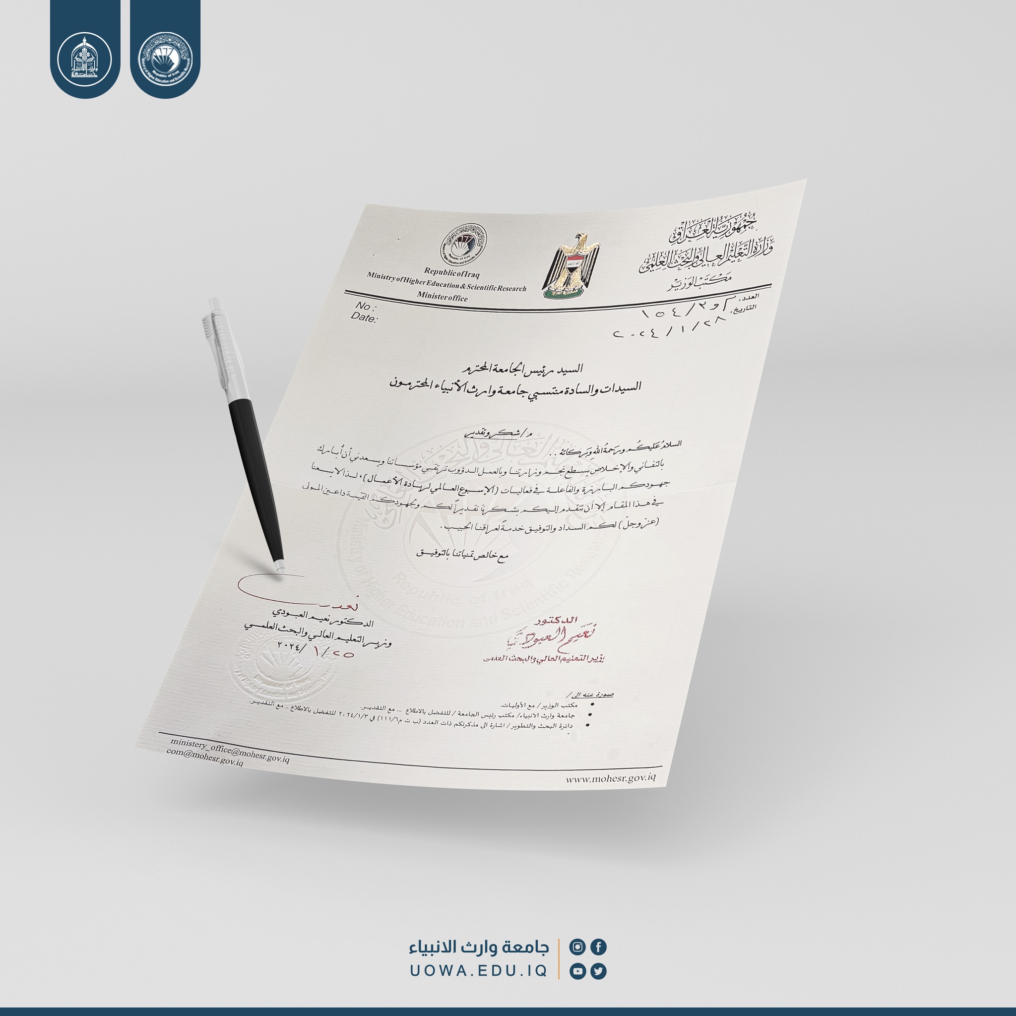 Dr. Naeem Al-Obaidi, the Minister of Higher Education and Scientific Research, presented a "letter of thanks and appreciation" to the Presidency of Warith Al-Anbiyaa University (peace be upon him) in recognition of the efforts exerted in supporting the activities of the Global Entrepreneurship Week. This recognition comes in appreciation of the effective role played by the university in enhancing and developing entrepreneurship skills among students and the academic community. The minister expressed his wishes for success and prosperity to Warith Al-Anbiyaa University in serving our beloved Iraq.